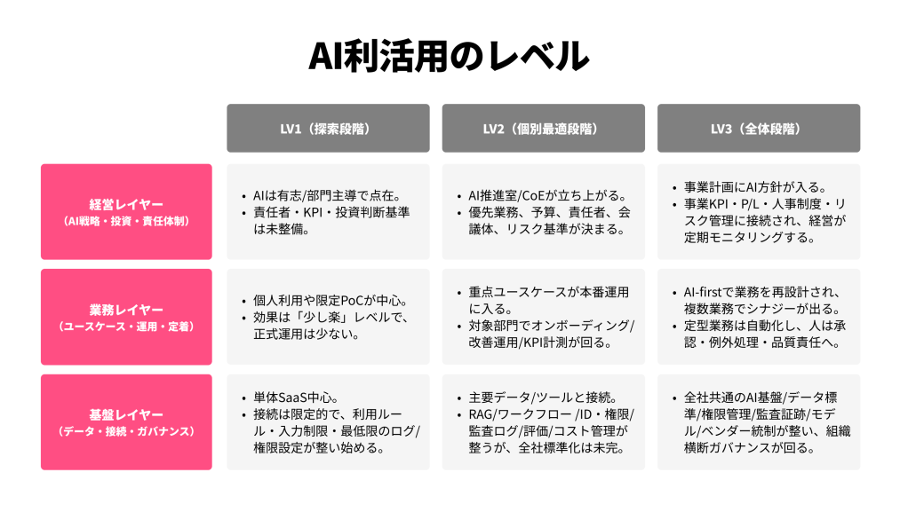 ここで極めて重要な視点は、AIを単なる「便利なITツール」として矮小化しないことです。実務上、AI活用の習熟度は以下の3つのレイヤーで多層的に捉える必要があります。