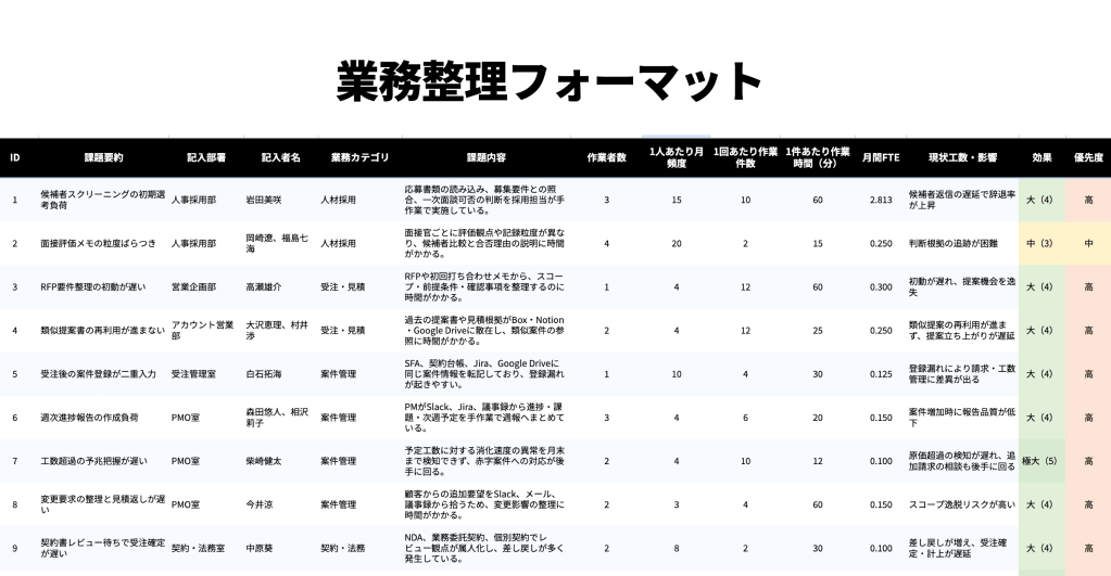 - インパクト(期待効果):業務頻度、対象人数、総工数、他部門への横展開の可能性、売上・品質への寄与度。