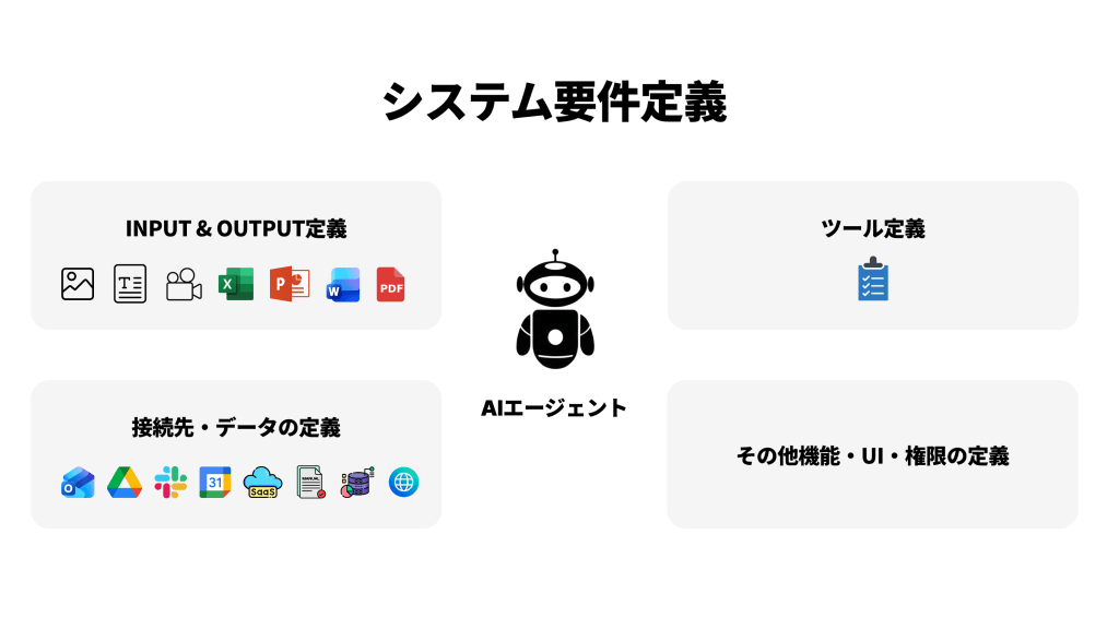 - 接続先・データの定義:Google Drive、Notion、Jira、社内DBなど、どの接続先を参照するか。また、外部参照する時に、どのウェブサイトをどのような仕組みで情報を取ってくるか、ログインが必要かどうか。