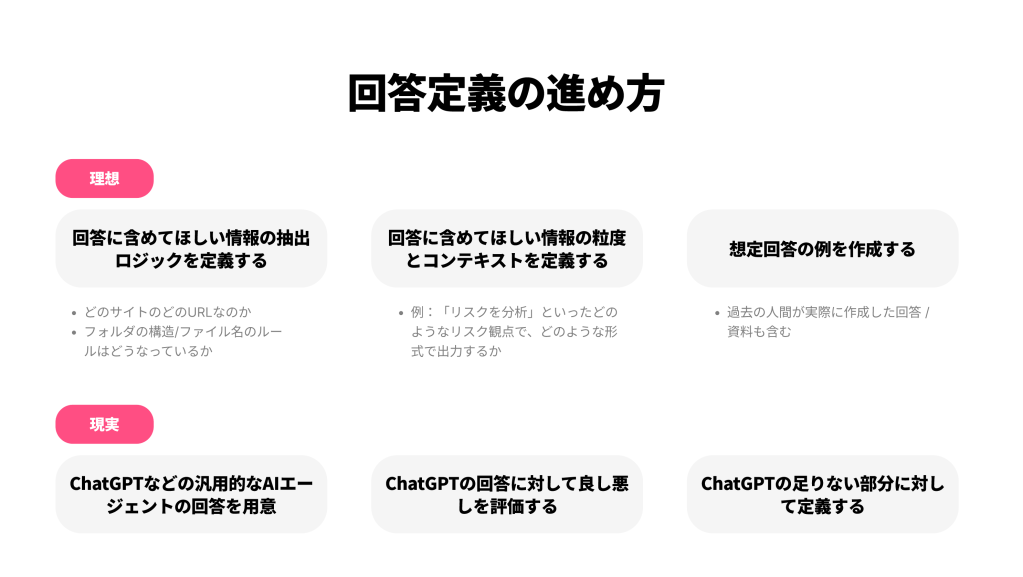 ここで有効な手法が、「期待される質問(プロンプト)」と「理想的な回答」をセットで具体化することです。 例えば、「契約書のリスク分析を行う」という定義だけでは不十分です。