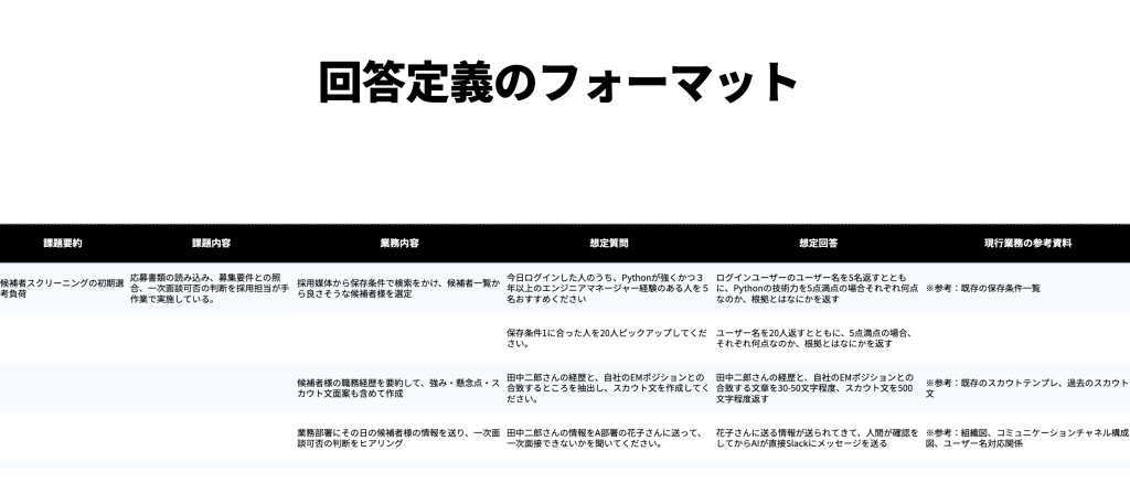 AIプロジェクトにおいて真に難易度が高く、かつ成果を左右するのがこの「レスポンス要件」です。一言で言えば、「どのような問いに対し、どの程度の粒度・形式・品質で回答を返すべきか」という知的なアウトプットの定義です。