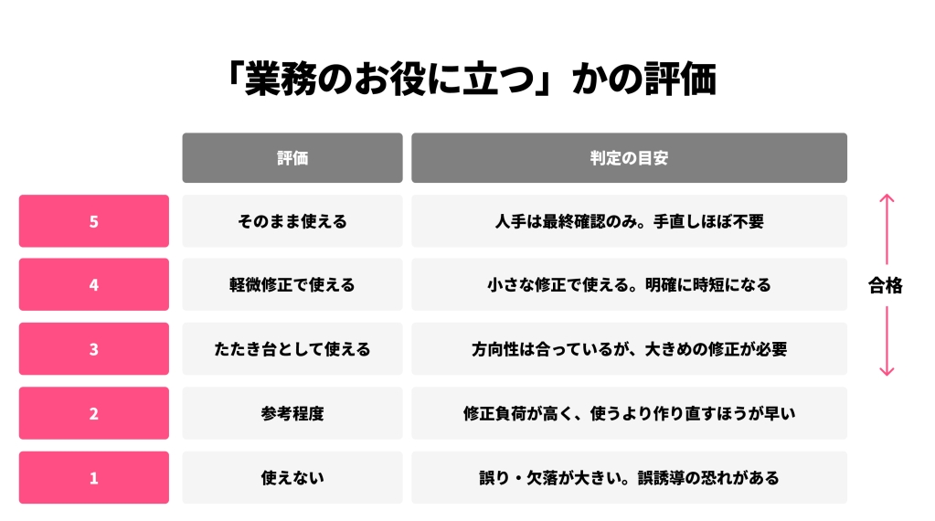 - 出力形式・ルールの遵守:指定したフォーマットや、遵守すべき業務ルール(禁則事項など)に沿っているか。